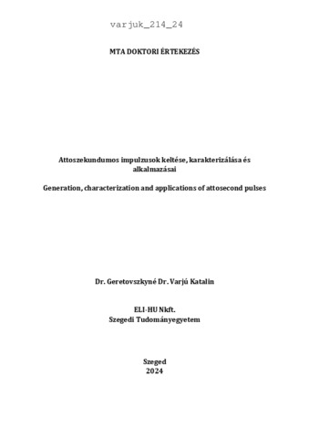 Varjú, Katalin (2025) Attoszekundumos impulzusok keltése, karakterizálása és alkalmazásai = Generation, characterization and applications of attosecond pulses. Doctor of the Hung. Acad. of Sci. thesis, Szegedi Tudományegyetem.