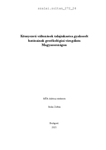 Szalai, Zoltán (2025) Környezeti változások talajtakaróra gyakorolt hatásainak geoökológiai vizsgálata Magyarországon. Doctor of the Hung. Acad. of Sci. thesis, HUN-REN Csillagászati és Földtudományi Kutatóközpont.