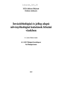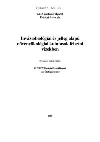 Lukács, Balázs András (2025) Invázióbiológiai és jelleg alapú növényökológiai kutatások felszíni vizekben. Doctor of the Hung. Acad. of Sci. thesis, HUN-REN Ökológiai Kutatóközpont.