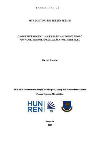 Feczkó, Tivadar (2025) Gyógyszermolekulák és fázisváltó hőtároló anyagok mikrokapszulázása polimerekkel. Doctor of the Hung. Acad. of Sci. thesis, Természettudományi Kutatóközpont.