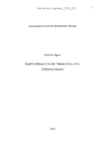 Kelevéz, Ágnes (2025) Babits Mihály Összes versei 1906-1910. Kritikai kiadás. Doctor of the Hung. Acad. of Sci. thesis, PIM.